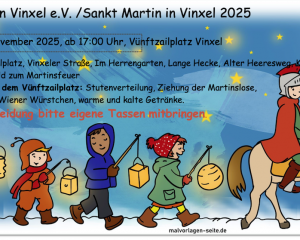 Der Bürgerverein Vinxel e.V. lädt wieder für Samstag, 16. November 2025, ab 17:00 Uhr zur Start des Sankt Martin Zugs auf den Vünftzailplatz in Vinxel