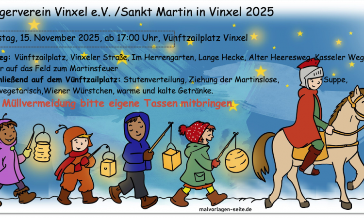 Der Bürgerverein Vinxel e.V. lädt wieder für Samstag, 16. November 2025, ab 17:00 Uhr zur Start des Sankt Martin Zugs auf den Vünftzailplatz in Vinxel ein.